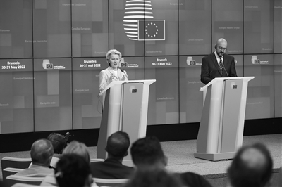5月31日,在比利时布鲁塞尔,欧盟委员会主席冯德莱恩(左)和欧洲理事会主席米歇尔在欧盟特别峰会后举行新闻发布会。 为期两天的欧盟特别峰会5月31日结束。除决定对俄罗斯实施部分石油禁运外,欧盟还决定增强自身防务能力,逐渐摆脱对俄能源依赖。 新华社记者 郑焕松 摄