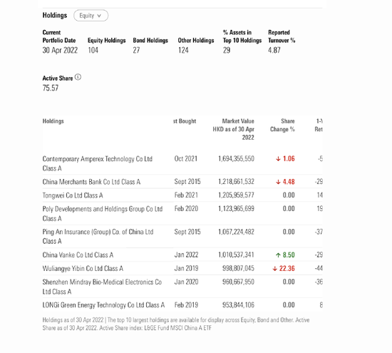 截至4月底,基金的前十大重仓股为宁德时代、招商银行、通威股份、保利发展、中国平安、万科A、五粮液、迈瑞医疗、隆基股份等。