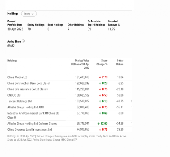 截至4月底,组合的前十大重仓股是中国移动、建设银行、中国人寿、中海油、腾讯控股、阿里巴巴(ADR)、工商银行、阿里巴巴(港股)、中国海外发展。
