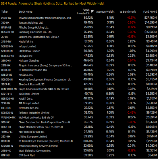 全球基金研究机构Copley 基金研究 日前发布了全球基金持仓情况,并整体了全球基金最喜爱的基金持仓。我们来关注对A股小伙伴影响最大的全球新兴市场基金的持仓情况。Copley基金研究的数据库中收录了252个主动管理策略基金,合计规模超过4000亿美元。