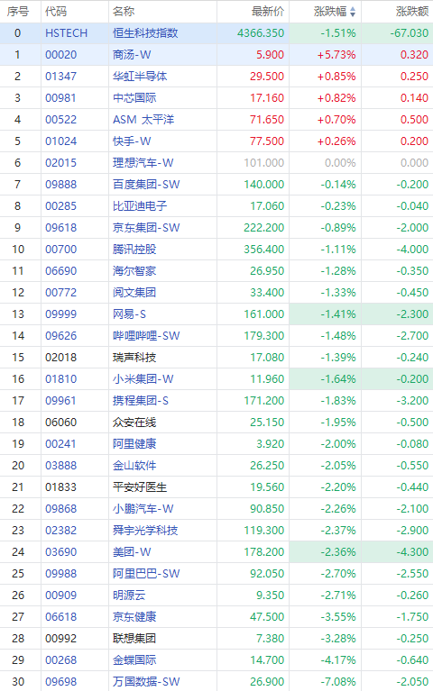 万国数据盘中跌幅扩大逾7%,领跌科技股;金蝶国际跌超4%,阿里巴巴-SW、美团-W等跌超2%,小米、腾讯控股跌超1%。