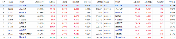 截至发稿,时代电气A股涨6.64%,H股涨3.38%;金力永磁A股涨5.21%,H股涨1.81%;长城汽车A股涨4.97%,H股涨7.34%。