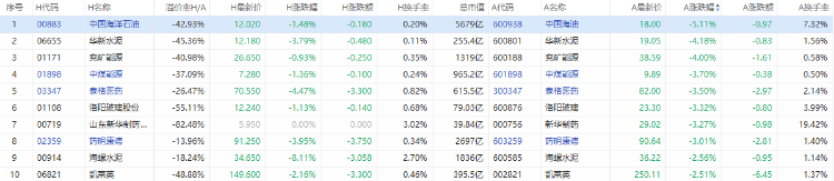 中国海洋石油A股跌5.11%,H股跌1.48%;华新水泥A股跌4.18%,H股跌3.79%;兖矿能源A股跌4.00%,H股跌0.93%。