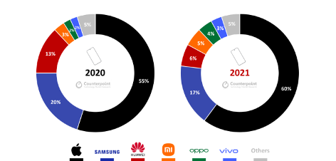 图:2021年全球400美元以上智能手机销量份额 (来源:Counterpoint)