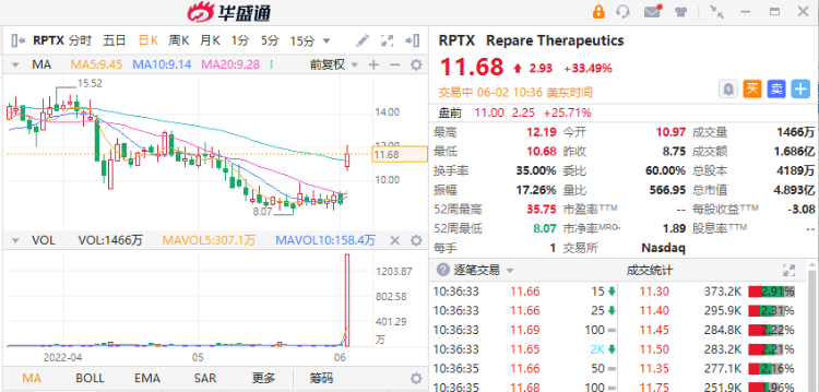 华盛资讯6月2日消息,美股盘中,Repare Therapeutics 涨近35%,成交量超过1400万,超过之前10日平均成交量的75倍。
