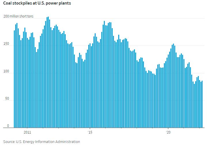 在美国,9月份发电厂的煤炭库存已经触及了20世纪70年代以来的最低水平,并不断被强劲的需求所消耗。根据美国能源信息署(EIA)的最新数据,3月份美国发电厂的煤炭库存比过去13年的平均水平低出了约44%。