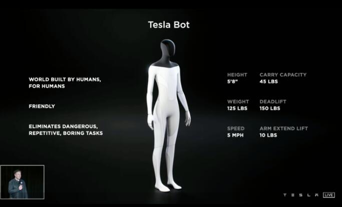 根据马斯克此前披露的信息,这一人形机器人身高为5英尺8英寸(1米72),体重为125磅(约56公斤)。行走速度可达每小时5英里,最多可提45磅的物品。该机器人将由“轻质材料”制成,看上去比人的皮肤还光滑,其操作系统将基于特斯拉电动汽车的人工智能系统打造。