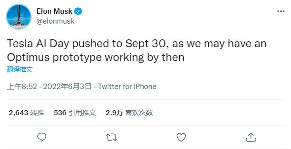 特斯拉CEO马斯克在北京时间周五早间发推表示,第二届特斯拉人工智能日活动将推迟到9月30日,届时可能会有一台人形机器人“擎天柱”(Optimus)的原型机运行。