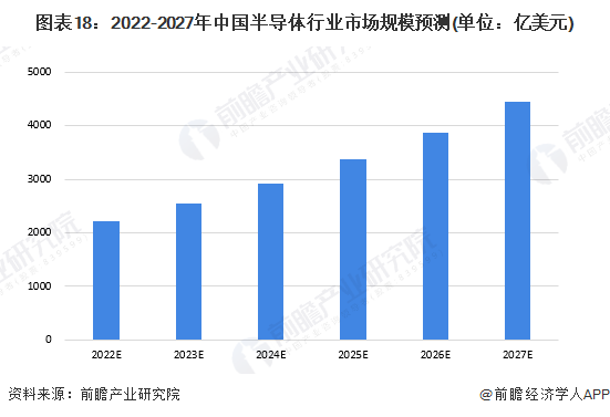 根据近年来我国半导体行业市场增速以及下游需求市场增长趋势,前瞻初步估计,2022-2027年我国半导体行业市场规模将以15%左右的增速增长,到2027年我国半导体行业市场规模有望4453亿美元。