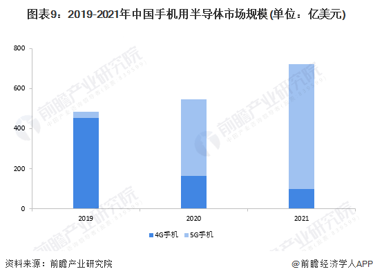 根据中国手机出货量及单个手机所用半导体价值量对手机领域所用半导体市场规模进行测算,得出2021年中国手机用半导体市场规模达到723亿美元。其中,5G手机市场的快速增长给半导体行业带来了极大的推动,2021年5G手机用半导体市场规模达到622亿美元。