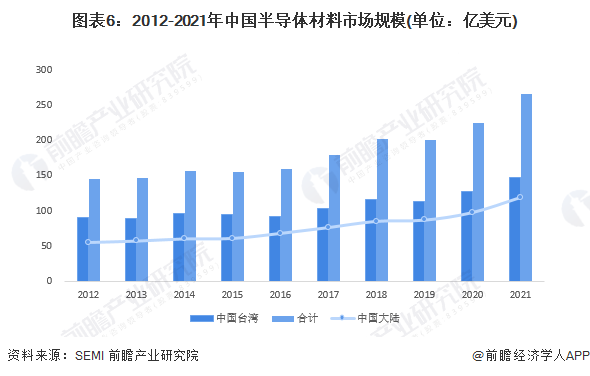 半导体材料和设备是半导体产业链的基石,是推动集成电路技术创新的引擎。在国家鼓励半导体材料国产化的政策导向下,本土半导体材料厂商不断提升半导体产品技术水平和研发能力,逐渐打破了国外半导体厂商的垄断格局,推进中国半导体材料国产化进程。根据SEMI统计数据,2012-2021年期间我国半导体材料市场规模总体呈波动增长态势。2021年中国台湾为全球最大的半导体材料市场,市场规模达到147.1亿美元,同比增长15.7%;中国大陆为第二大市场,规模为119.3亿美元,同比增长21.9%。