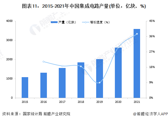 国家统计局统计数据显示,2015-2021年,我国集成电路产量逐年增加,2021年产量创下新高,达到3594.3亿块,同比增长37.5%。