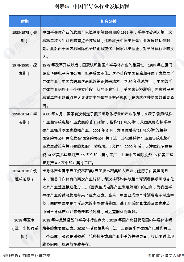 中国半导体行业发展可分为1953-1978(初期)、1978-1990(探索期)、1990-2014(成长期)、2014-2018(快速成长期)和2018年至今(进一步加强重视期)。