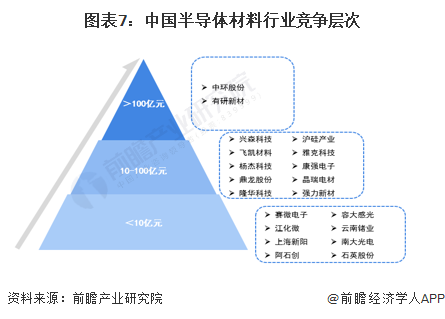 目前国内生产半导体材料的上市公司主要有沪硅产业、中环股份、南大光电、华特气体等,涵盖半导体制造的前端晶圆制造材料和后端封装材料。根据2020年的营业收入规模进行分类发现,营业收入大于100亿元的企业仅有中环股份和有研新材,而在10-100亿之间和10以下的企业较多。整体来看,半导体行业的上市公司整体规模依然较小。