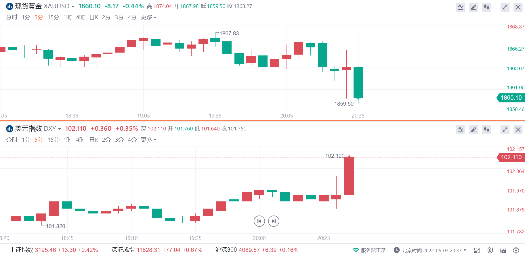 数据公布后,现货黄金触及1860美元/盎司,美元指数突破102关口。10年期美债收益率涨3个基点,至2.9479%;美股股指期货小幅短线拉升,纳指期货跌幅收窄至0.8%。