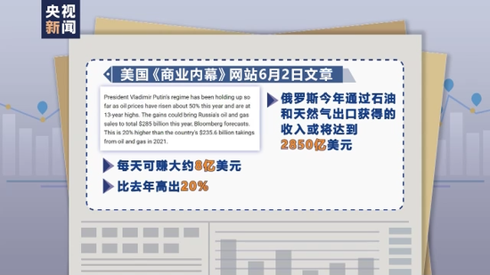 “尽管受到制裁和抵制,俄罗斯今年仍然可以每天从石油和天然气中赚取8亿美元——比去年还要多。”美国《商业内幕》网站2日以此为题发表文章。文章援引据彭博社预测数据称,因国际能源价格飙升,俄罗斯今年通过石油和天然气出口获得的收入或将达到2850亿美元,也就是每天可赚大约8亿美元,比去年高出20%。