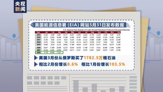 美国也在大量买入俄罗斯石油。美国能源信息署(EIA)网站5月31日发布的最新数据显示,美国3月份从俄罗斯买了1782.5万桶石油,相比2月份增长8.6%,相比1月份增长103.5%。