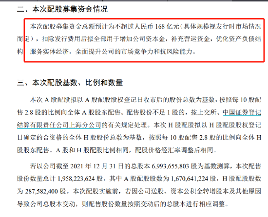 4月18日,东方证券发布公告,公司按每10股配售2.8股的比例向全体A+H股股东配售19.58亿股,配股价8.46元/股,募集资金总额预计不超过168亿元,其中,A股配股16.71亿股,募资总额不超过143.33亿元;H股配股2.88亿股,募资总额不超过24.67亿元。