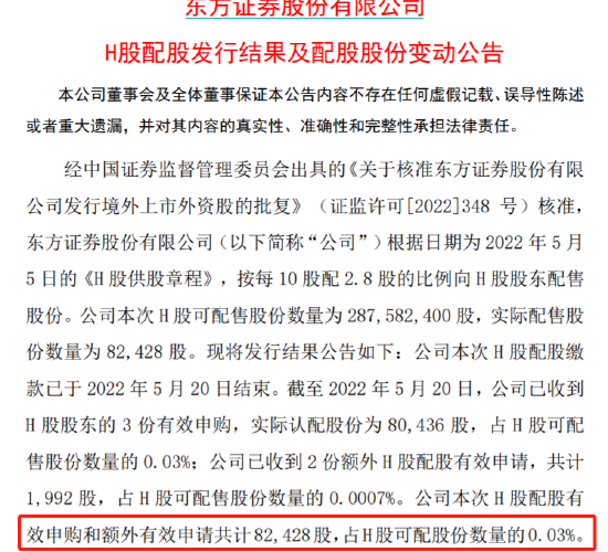 4月29日,根据配售结果,东方证券A股配售有效认购15.03亿股,总金额127.15亿元,占可配售A股股份总数比例的89.96%,大股东认购了近三成。而H股配售结果在5月28日才结束,公司共计配售2.88亿股,而有效认购只有8.24万股,配售量占比只有0.03%,这意味着H股弃购率高达99.7%。
