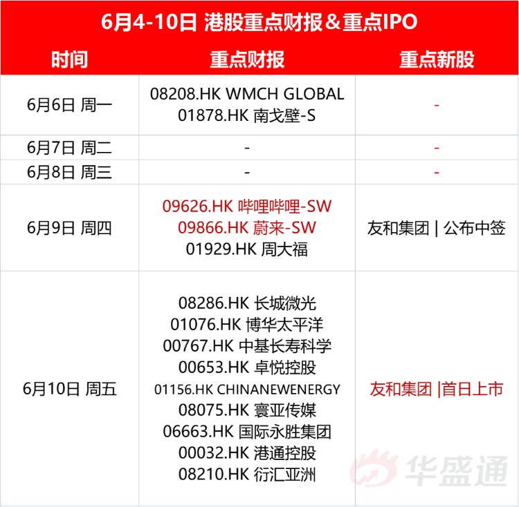 下周四,哔哩哔哩和蔚来汽车财报重磅来袭!新股方面,友和集团将于周四公布中签结果,周五正式挂牌。