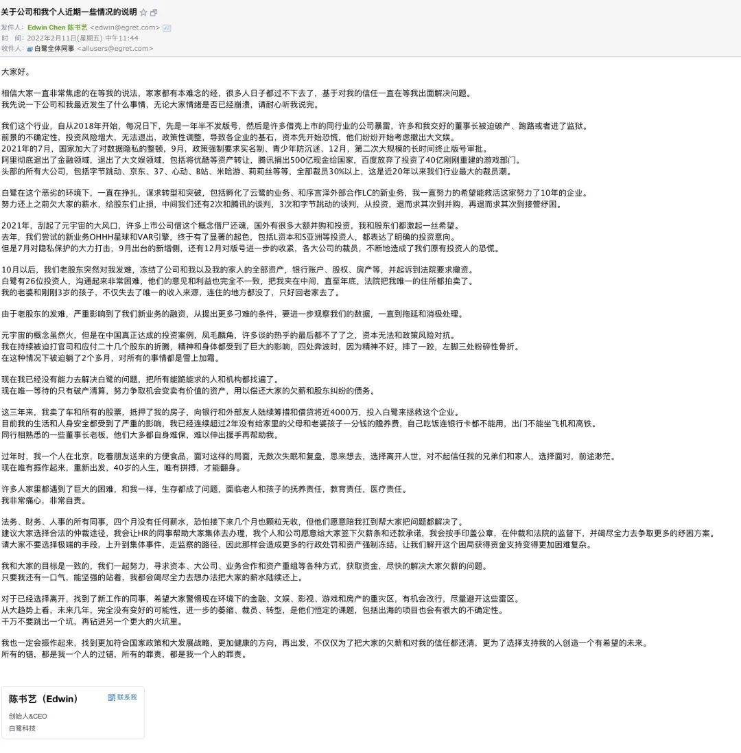 社交平台上也开始流传一张今年2月陈书艺发布的内部信。在内部信中,他提到2021年10月之后,老股东突然对其发难,冻结了公司和其全部资产,并起诉到法院要求撤资。陈书艺提到:”白鹭共有26位投资人,沟通起来非常困难,意见和利益完全不一致,直至年底,法院把我唯一的住所拍卖了。“
