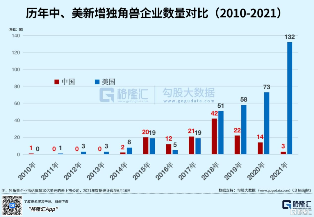 这段时间正好对应的是中国移动互联网的井喷、高峰和见顶,不过值得注意的是,在中国移动互联网井喷的那几年,中国的独角兽数量是超越美国的,但2019年之后,开始大幅被抛离,到去年变成了3:132,美国的独角兽迎来井喷,但中国的独角兽几乎绝迹。