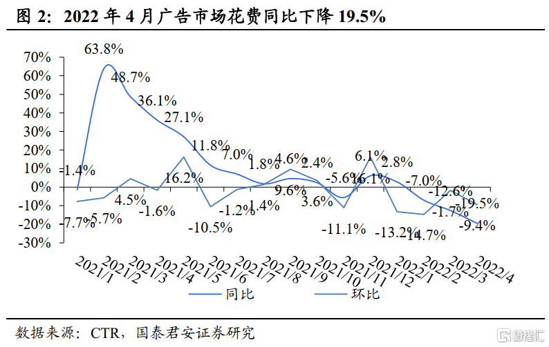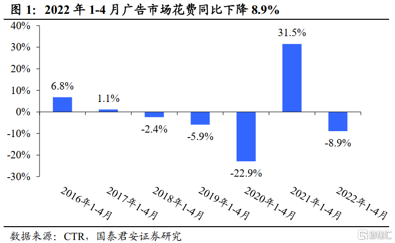 2022年1-4月受全国多地疫情影响,广告市场遇冷。根据CTR的数据,2022年1-4月广告市场投放花费同比下降8.9%,是除2020年1-4月以外近7年同比第二大降幅。月度数据来看,2022年4月广告投放费用同比下滑19.5%,环比下滑9.4%,其中同比数据为2021年1月以来单月下滑最大值。