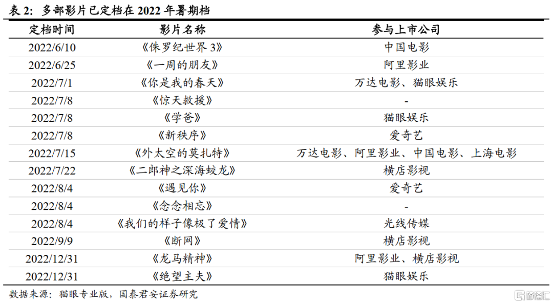 营业影院数量近万家,多部影片定档提振暑期档信心。3月初我国营业影院数量超过1万家,但随着上海、北京等地开始疫情管控,营业影院数量在4月12至降至低点5,180家。后续随着疫情得到缓解,劳动节期间全国新增营业影院数量超过1,000家。截止6月3日,全国营业影院数量为9,659家,已接近疫情前的水平。同时,多部影片已定档在2022年暑期档,显示影视公司对影院复工复产的信心。截止2022年6月4日,根据猫眼专业版的数据,进口电影《侏罗纪世界3》定档6月10日,同步北美上映;多部国产高热度影片《一周的朋友》、《你是我的春天》、《惊天救援》、《学爸》、《新秩序》、《外太空的莫扎特》等定档2022年暑期档。