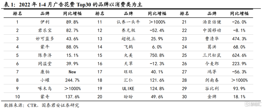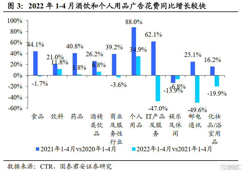 聚焦广告主结构,饮料、药品、酒精类饮品和个人用品在2022年1-4月广告投放仍呈现正增长。根据CTR的数据,2022年1-4月饮料、药品、酒精类饮品和个人用品广告投放分别同比增长11.8%/1.8%/6.8%/34.9%,即便经受疫情考验,消费类广告主仍保持了正向的投放增长。