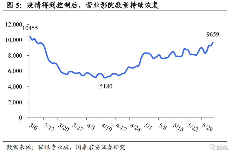 疫情得到控制后,全国营业影院数量逐渐恢复至疫情前水平,提振影视院线板块信心。根据猫眼专业版的数据,3月初我国营业影院数量超过1万家,但随着上海、北京等地开始疫情管控,营业影院数量在4月12至降至低点5,180家。后续随着疫情得到缓解,劳动节期间全国新增营业影院数量超过1,000家。截止6月3日,全国营业影院数量为9,659家,已接近疫情前的水平。