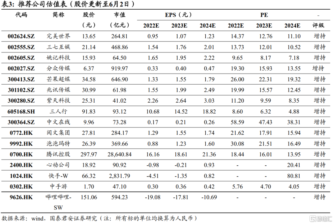 同时,多部影片已定档在2022年暑期档,显示影视公司对影院复工复产的信心。截止2022年6月4日,根据猫眼专业版的数据,进口电影《侏罗纪世界3》定档6月10日,同步北美上映;多部国产高热度影片《一周的朋友》、《你是我的春天》、《惊天救援》、《学爸》、《新秩序》、《外太空的莫扎特》等定档2022年暑期档。影视院线板块复苏趋势强劲,推荐标的光线传媒,受益标的万达电影、中国电影、上海电影等。
