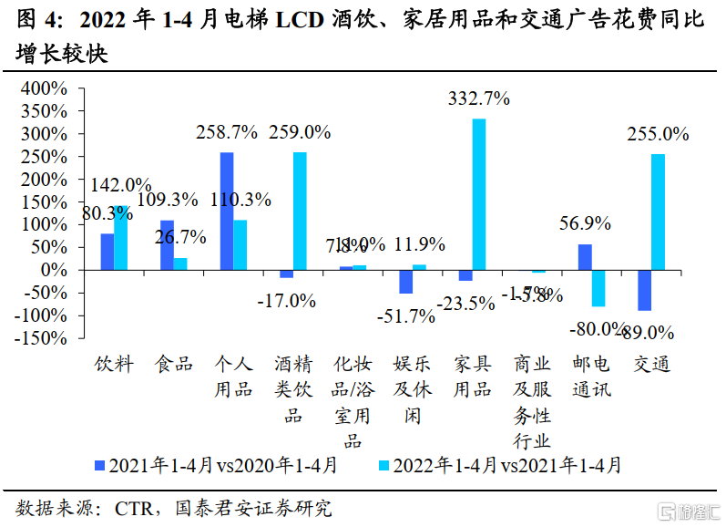 其中,在电梯LCD广告主结构方面,饮料、个人用品、酒精类饮品、家具用品和交通类广告投放同比增长尤为明显。根据CTR的数据,2022年1-4月饮料、个人用品、酒精类饮品、家具用品和交通在电梯LCD投放分别同比增长142%/110%/259%/333%/255%,增速均在三位数以上。此外,食品、化妆品、娱乐及休闲广告同比也呈现正增长。