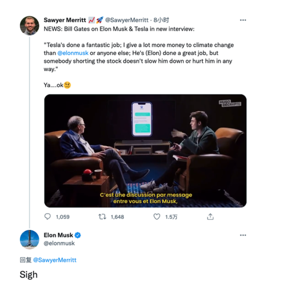 马斯克随后在报道盖茨这一采访的推文下用叹气回应道:“唉!”