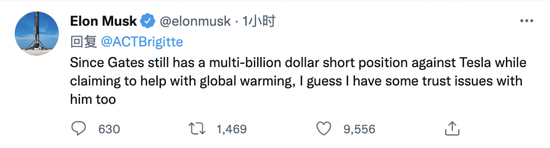 他表示,盖茨一边声称要帮助解决全球变暖问题,一边还“数十亿美元”做空特斯拉,“我想我对他有一些信任问题”。