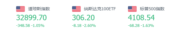 道琼斯指数本周0.94%,报32899点;纳斯达克指数本周下跌0.98%,报 12012点;标普500本周下跌 1.2%,报4108点。美股周五收跌,道指跌约350点,纳指下跌近2.5%,特斯拉收跌9.22%,苹果收跌3.86%,英伟达收跌4.45%。