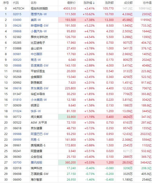 成分股中,理想汽车涨10.65%领涨,报111.5港元每股;科网股普涨,美团绩后涨超7%,报193.5港元每股,成交额45.98亿港元;B站涨5.22%,百度、京东涨2%,小米、快手跟涨超1%,阿里、腾讯微涨。