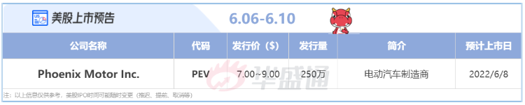 本周市场预计将迎来一只新股,电动汽车公司Phoenix Motor $PEV 。不过,美股IPO时间可能随时变更(包括提前等),投资者需关注实时更新信息。