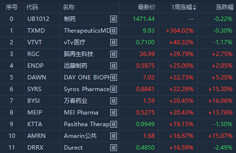美股医药股方面,截至发稿的近一周以来,TherapeuticsMD(TXMD)涨超364%,位列美股制药板块涨幅榜Top1,公司宣布将被作价每股10美元收购;另外,阿尔茨海默药物研发公司vTv上周涨幅达40.32%。