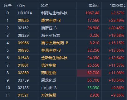港股医药板块近期表现亮眼,药明康德、康龙化成等CRO概念今日领涨;康方生物-B在研肺癌药物疗效数据良好 ,截至发稿股价周涨幅23.49%,位列港股制药周涨幅榜Top1。