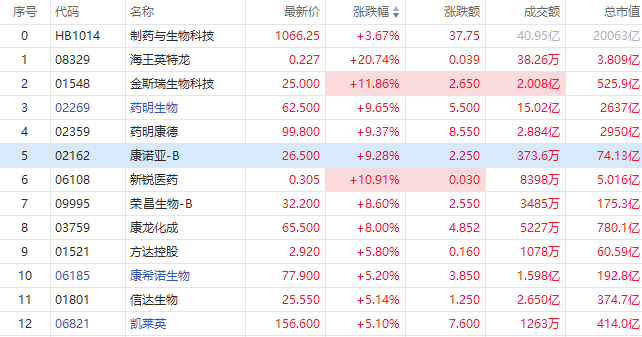 华盛资讯6月6日消息,港股制药与生物科技板块午后持续走高。截至发稿,海王英特龙涨超20%,药明生物涨9.65%,报62.5港元每股;药明康德、新锐医药涨超9%;康龙化成、康希诺生物、凯莱英等跟涨。