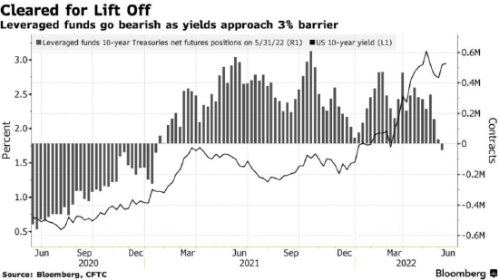 美国商品期货交易委员会(CFTC)的最新数据显示,5月底,杠杆基金净做空10年期美国国债。这是他们自2021年1月以来首次看跌10年期美国国债。