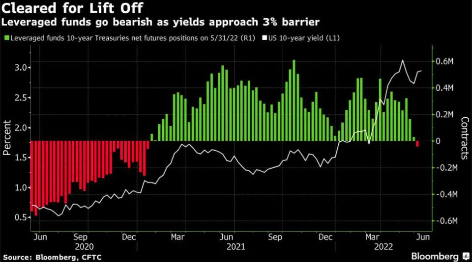 根据美国商品期货交易委员会上周五公布的最新数据,截止5月底,杠杆基金也已转向净看空美国国债。这是它们自2021年1月以来首次看跌美国国债。