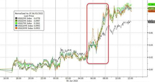 行情数据显示,隔夜各期限美债收益率普遍大涨,整个收益率曲线至少上升了7个基点:2年期美债收益率上涨7.5个基点报2.74%,5年期美债收益率上涨10个基点报3.041%,10年期美债收益率上涨10.5个基点报3.046%,30年期美债收益率上涨10.8个基点报3.199%。