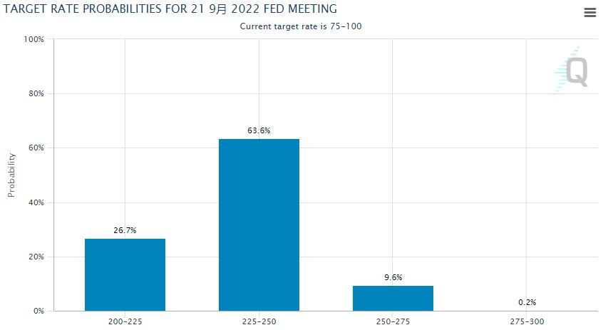 根据芝商所的美联储观察工具显示,美联储在6月、7月和9月会议上连续三次加息50个基点的概率约为63.6%,在未来三次会议中的某次会议出现75个基点加息的概率也达到了9.6%。
