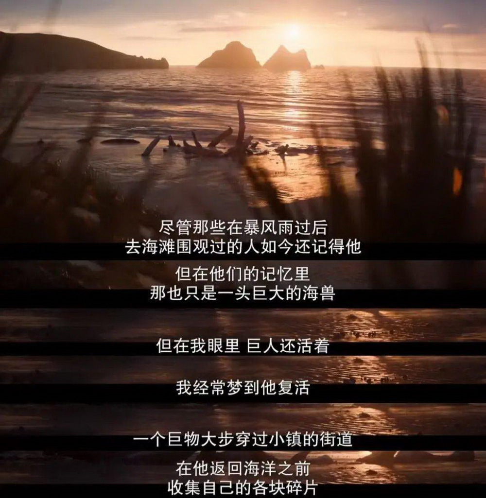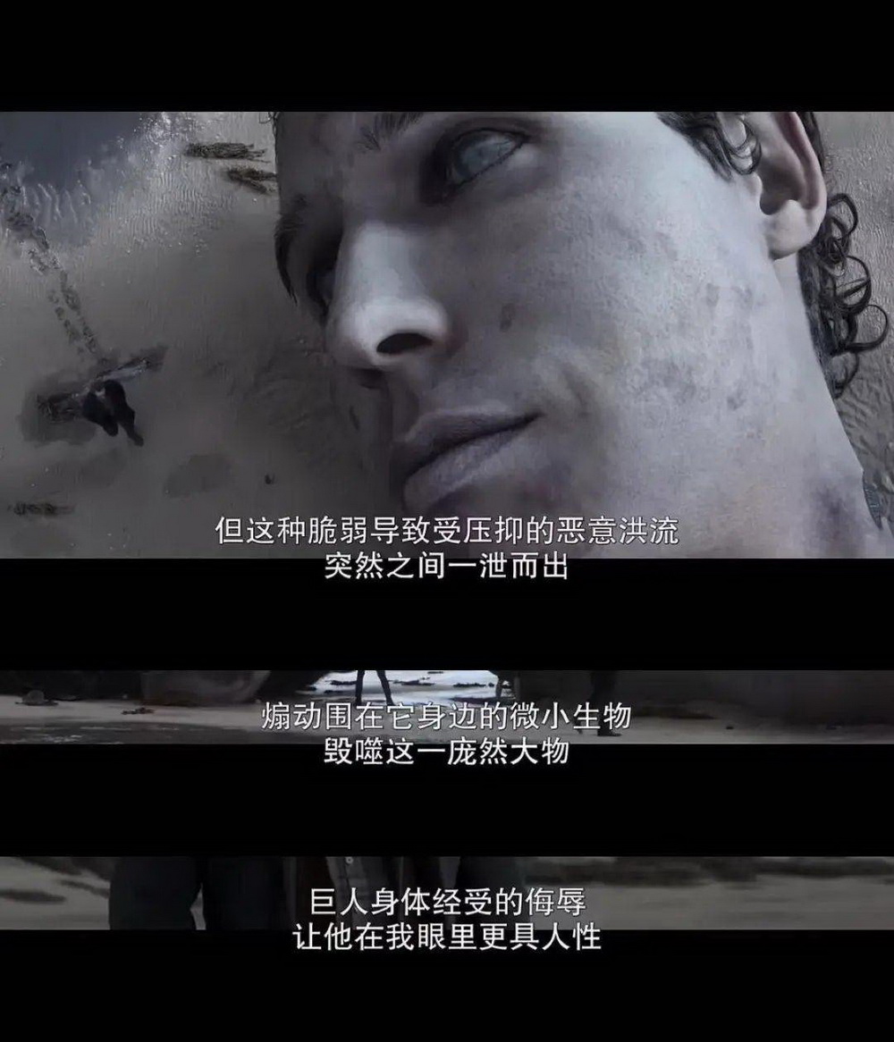 在充满血腥、暴力、奇观的《爱死机》故事序列中,这个故事显得平静又哀伤,简单的场景,第一人称思辨的、诗一样的语言时刻提醒着观众去注意溺亡的巨人的象征性与寓言性,它以自身的消逝和磨损摹仿了历史上存在过的一切伟大的艺术、伟大的文明的消亡。