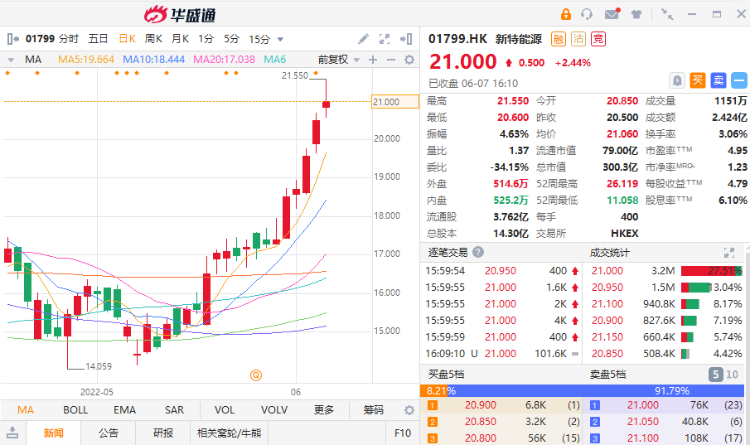 消息面上,5月30日,国家发改委、国家能源局发布《关于促进新时代新能源高质量发展的实施方案》,旨在锚定到2030年我国风电、太阳能发电总装机容量达到12亿千瓦以上的目标,加快构建清洁低碳、安全高效的能源体系。业内人士指出,该实施方案的出台无疑是给整个太阳能产业链、风电产业链带来重磅利好。