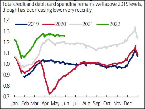 美国银行的信用卡和借记卡数据显示,美国家庭的消费支出继续保持稳健水平,特别是在旅行、娱乐等服务性领域。5月份信用卡和借记卡消费总额同比增长9%,信用卡消费增长16%,借记卡增长4%。