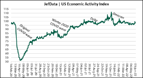 Jefferies LLC首席经济学家Aneta Markowska监测一个由餐厅预约、零售网站访问量和交通数据等各分类指标组成的指数。该指数在今年大部分时间窄幅波动后于5月份出现上升。