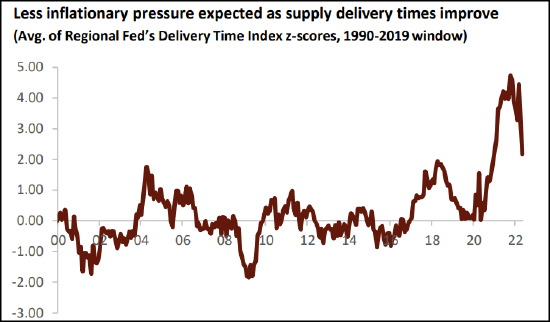 工业生产在4月份创下2020年10月以来的最快四个月增长率。Renaissance Macro Research的交付时间跟踪指标降至2020年12月以来最低水平。