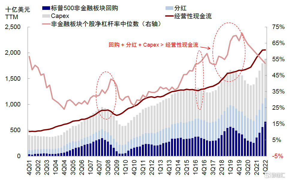 首先,美联储紧缩对于回购最直接的影响是通过金融条件和融资成本来实现。3月以来,随着紧缩预期升温,美债利率和信用利差等金融条件指数都快速走高,叠加6月开始缩表,都将抬升融资成本。不过,这一影响更多限于现金流不足以覆盖回购和分红的公司,如我们正文中测算,这一比例约25%左右,这其中杠杆水平较高的板块受影响相对更大。